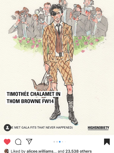 Artist Aggie Whelan Kenny was commissioned by brand 'HighSnobiety' to create some 'fashion fan-fiction' for the Met Gala 2020 which never happened. They pulled together some of their most optimistic expectations of outfits, for some of the Gala's best-dressed regulars, all pictured below: